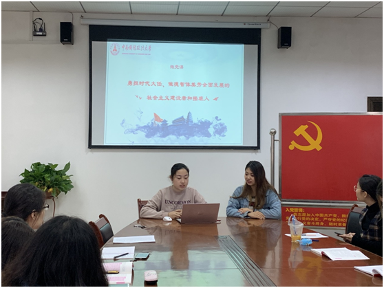 第三部分为学生党员微党课的展示。喻妍同学结合实际解读了习近平总书记关于青年成长成才重要论述精神,希望各位党员能明确使命担当,坚持正确方向,练就过硬本领,同时也强调了与我们密切相关的学术诚信的问题。陈淼同学讲述了习近平总书记七年里的植树故事及我国生态文明建设的方针政策,让各位党员意识到我国生态文明建设已迈上新台阶,要积极做生态文明建设的推动者、实践者。