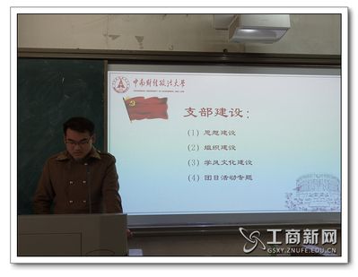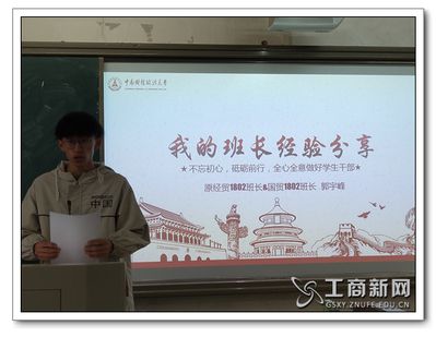 随后,原经贸1802班班长郭宇峰就如何提高团日活动的参与率、如何建立正确的思想引领与价值引领、如何管理班级的日常工作、如何平衡班团事务与学习时间等四个方面展开了详细的介绍。此外,他指出团干部要提升自身能力,发挥班级团队精神,关心同学,敢于担当和创新。
