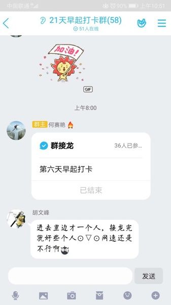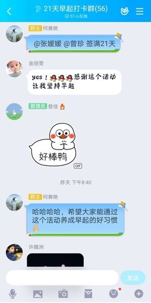 活动开始前,工作人员通过工商学院研究生会的公众号、各班微信群、QQ群等平台宣传本次活动,创建互动式QQ群,除了早起打卡外,同学们还可在此交流假期的学习心得和经历。活动以21天为周期,是养成习惯的最短周期,拟帮助同学们在疫情期间养成早起的规律作息,更好地利用时间。活动期间,同学们积极参与,一到打卡时间早上八点,就有许多同学准时在QQ群里打卡。