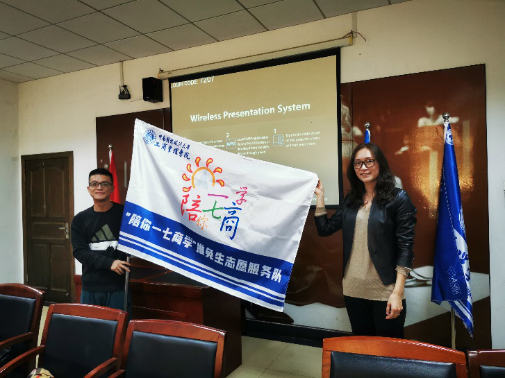 接着,李芳副书记宣布“陪你17商学”推免生志愿服务队正式成立,并向推免生代表授旗。