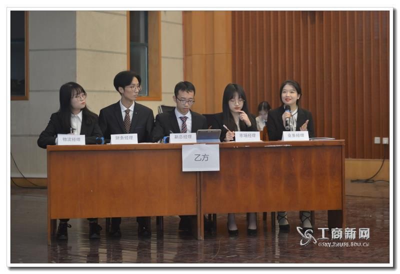本次商务谈判比赛内容为宁湖公司与恒顺公司就合作模式的双方利益进行谈判。比赛伊始,由小组赛中加权成绩第三、四名的队伍“诺贝尔提名冲刺队”和“比奇堡五大才子队”率先进行谈判。其中乙方代表的恒顺公司态度坚决,为使利益最大化,一度坚持最低价格不松口。面对强势的乙方,甲方也据理力争,清晰阐明双方合作的必要性与利好。双方你来我往,场上气氛紧张激烈。