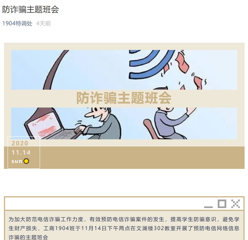 (通讯员 林杰 石佳腾)2020年10月-11月,7003菠菜导航网大全按照校保卫部《关于开展全校学生防电信网络诈骗宣传活动的通知》及《关于进一步加强校园“反电诈”宣传教育工作的通知》要求,为切实增强本学院师生员工防范电信网络诈骗的意识,提高防范能力,有效遏制校园电信网络诈骗案件高发的势头,切实维护本院各年级本科生的切身利益,陆续组织2017级,2018级,2019级,2020级本科生线上下相结合学习《近期警情通报》,并且以多种形式开展“反电信诈骗”主题学习活动。