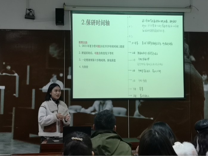 2020年11月30日在辅导员曾洁的安排与联络下,17级市场营销专业熊首聪师姐、李季瑾师兄在文泉五楼德鲁克会议室为18级师弟师妹倾心分享了自己保研经历,为18级同学未来保研读研之路提供了极具参考性的宝贵经验。