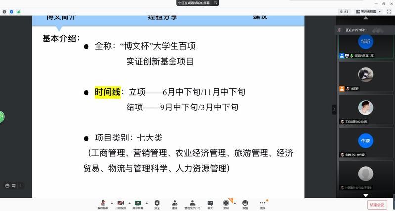 (通讯员:荆家纯)12月17日,为了更好地解答同学们在参与博文大创项目中的困惑,提高同学们参与学术科研实践的热情,国际贸易协会邀请了多次主持与参与博文项目的邹昕师姐与国家级大学生创新创业训练计划两度立项的行飞师姐通过腾讯会议网络平台为同学们答疑解惑。