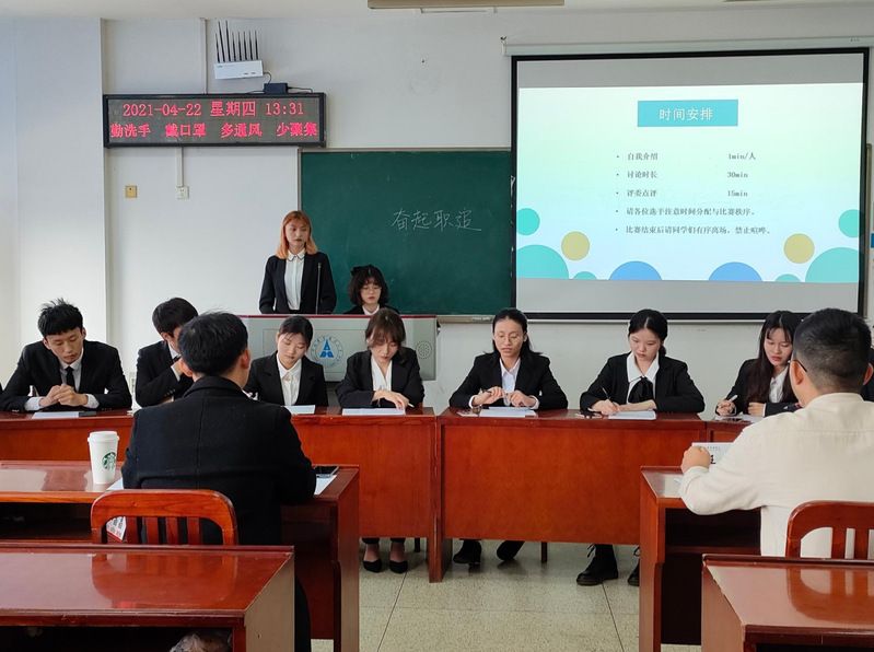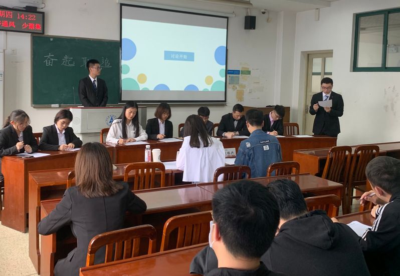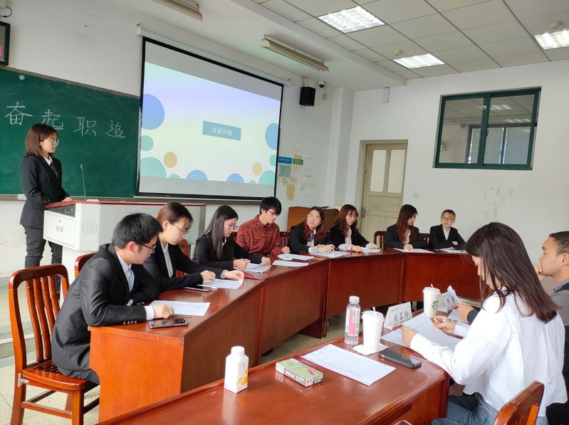 经班级自主报名,无领导小组讨论产生68名选手,共分为8组进行,每组8至9名人,选手们在规定的时间内围绕抽中的题目进行个人陈述、自由讨论及总结发言,人力资源专业教师刘雪梅、王淑红、汤一鹏、芦青老师,学生辅导员吴诗荣、刘铮、水晶晶、刘振兴、杨思琦老师,2017级毕业生党员代表代羽、邓朋昌、王彬、刘芷伶等共同担任活动评委。
