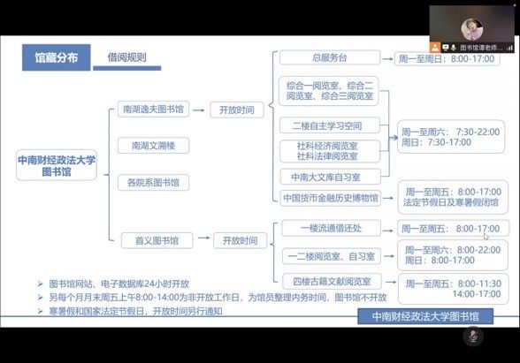 (通讯员 杨思琦、刘子源、王泽桐)金秋九月开学季,英雄之城谱华章。2021年9月8日,中南财经政法大学2021级本科新生图书馆入馆讲座在线上分批次举行,稳中求进,为在保持往年教学质量的基础上努力实现更好的教育效果。