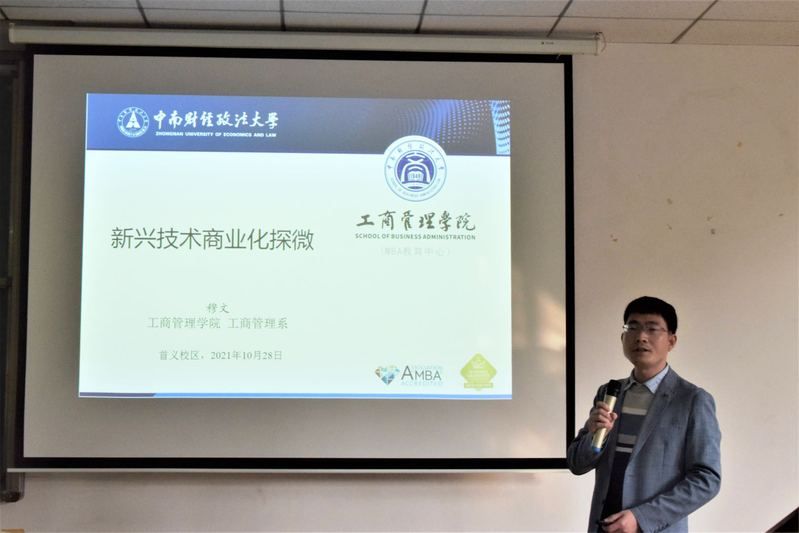 讲座伊始,穆文老师进行了简要的自我介绍,并通过一生动形象的商业趣事自然而然地引入课程——《新兴技术的商业化探微》,穆文老师以生动的比喻和趣味性的语调活跃了讲座的气氛,带动了同学们的积极性。