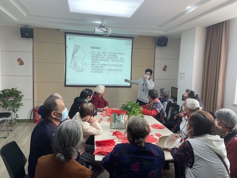 在之后的“你画我猜”环节中,老人们同样兴趣盎然,纷纷敞开手脚比划起“鸭子”、“自行车”、“热干面”等词语。活动现场欢声洋溢,气氛祥和温馨。志愿者也深受感染,表示:“希望能通过这些新鲜的游戏走进老人,了解老人的需求,听到老人的心声,更让他们感受到自己被他人陪伴着。”