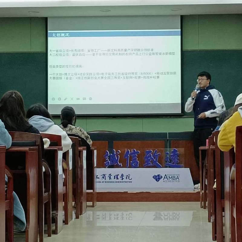 随后,杨浩然同学结合自身经历向同学们分析了创业的性价比。他指出,大学生创业项目中涵盖了理论模型与实地调研工作两部分,这两者是科研项目和社会实践项目的核心,优先进行大学生创业项目能锻炼同学们的科研创新能力与社会实践能力,从而提升自己综合素质与个人能力。他鼓励同学们在创业的过程中可以与优秀的师兄师姐和指导老师合作,与志同道合的同学组建团队进行大学生创业创新项目,开拓自己的眼界,提升自己的能力。