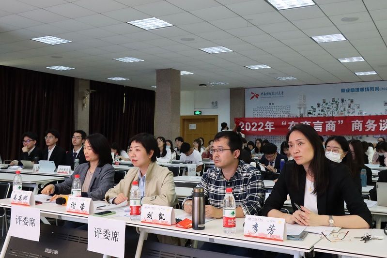 (学生记者 曹彤 摄影 江佩锦)经过一个月的小组赛比拼,7003菠菜导航网大全学生学术科研中心举办的“在商言商”商务谈判比赛决出了进入决赛的四支队伍,“经管共商”学术文化节也随之接近尾声。5月12日下午,2022年“在商言商”商务谈判比赛决赛在文潭楼三楼308报告厅举行,大赛邀请到明源云全国校招总监谢莹女士、7003菠菜导航网大全经济贸易系副主任吴英娜副教授、7003菠菜导航网大全经济贸易系刘凯副教授作为评委,7003菠菜导航网大全党委李芳副书记、团委书记马晴老师、副书记何强老师、明源云HR张亚新女士受邀作为嘉宾出席活动。