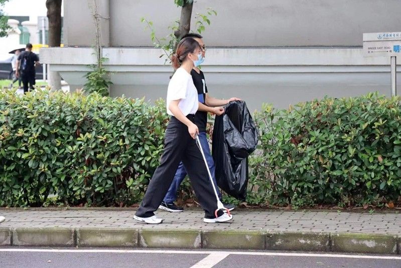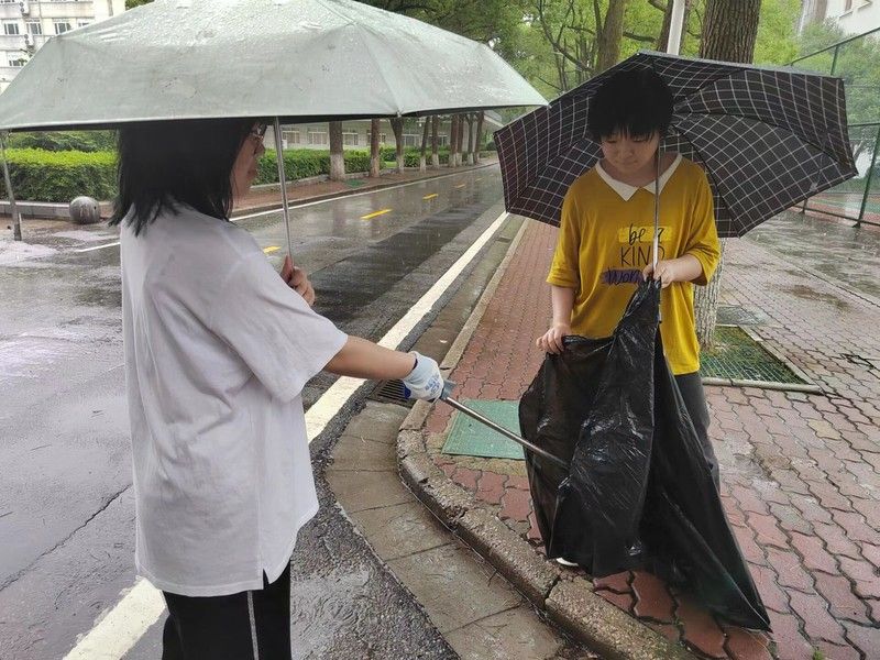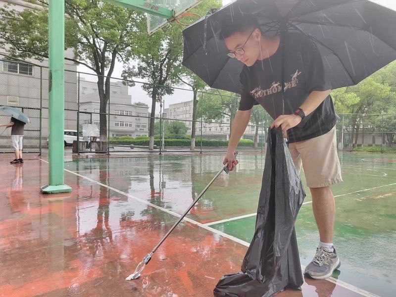 活动现场,志愿者们几人一组进行劳动,分别对各自的劳动区域进行了全方位细致的打扫。志愿者们认真劳动,专注且细心,用夹子夹起清洁区域的垃圾,清理路边的烟头和塑料,仔细检查花坛并拾起花坛里的碎屑。即使活动中途又下起淅沥小雨,仍浇不灭志愿者们的热情和耐心。