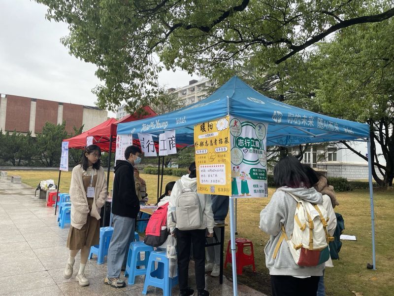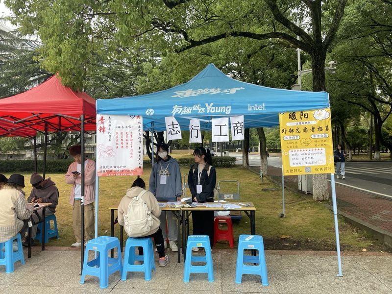 秋风起,寒意浓。即使天气恶劣,工商志协的志愿者们也不改热情洋溢的面貌,积极向往来的同学们分发传单,并引导有意愿的同学们扫码加入工商志协外部志愿者群,以便其进一步了解志愿服务信息。此外,帐篷下进行的青鸟志愿服务队一对一爱心信件活动的招募吸引了不少同学前来报名,仅用两小时就已满员。