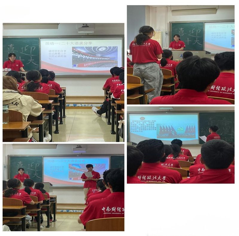 (通讯员 张子钰)青春逢盛世,奋斗正当时。明灯引航百余载,今天我们奏响了中国共产党第二十次全国代表大会的辉煌凯歌,也迎来了我辈青年踔厉奋进的新时代征程!为号召全体同学深入学习党的二十大精神,2022年10月20日下午2点,我院2206班全体成员于文润楼203教室开展以“学习二十大,青春颂党恩”为主题的班会活动。本次班会由班长余立睿和张铭蔚共同主持。