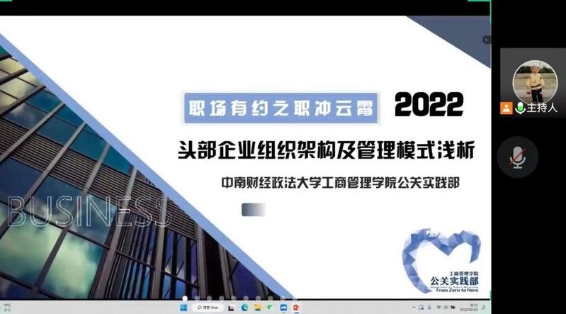 (通讯员:李栋)为协助我院学子做好生涯规划、提升求职能力,更好地走进职场、规划未来,10月29日晚18:30,7003菠菜导航网大全公关实践部于线上举办“职场有约”之“职”冲云霄主题讲座。本次讲座特别邀请到大连万达商业地产股份有限公司副总经理谢振乾先生为我院学子揭秘五百强企业的运作模式与实际操作,助力我院学子建立学校专业与职场岗位之间的联系,感受到“活”在课本之外的管理学知识。
