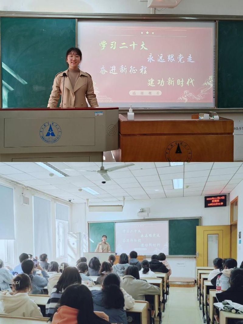(通讯员 沙芷名)为深入学习贯彻党的二十大精神,引导学生学习新思想,把握新动态,提高政治觉悟,提升党性素质,工商2202班于11月17日上午10:20在文泽203教室召开“奋进新征程,建功新时代”党的二十大精神宣讲活动暨11月团日活动主题班会,辅导员水晶晶老师到场参加。