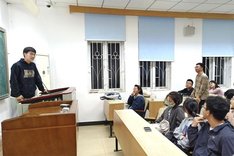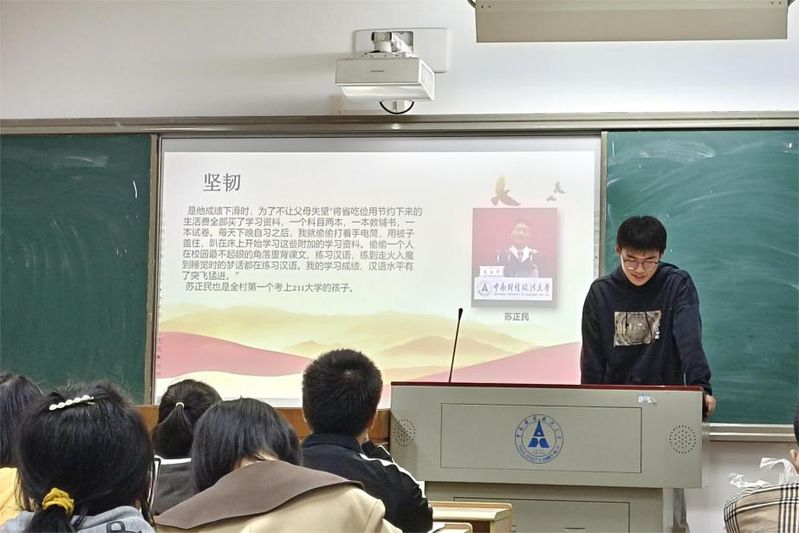 最后,辛逸阳同学从坚韧、感恩、奉献三个方面,向全体同学细致介绍了优秀青年榜样苏正民的事迹。介绍完毕后,辛逸阳同学组织全体同学观看了央视采访介绍苏正民的视频,使全体同学对这位优秀青年榜样有了更全面的了解。借由苏正民的光辉事迹,辛逸阳同学延伸介绍了中南财经政法大学其他优秀青年榜样,增强了全体同学对学校的归属感和认同感,更激发了大家努力拼搏、争当榜样的热情。