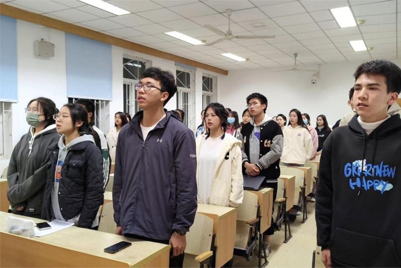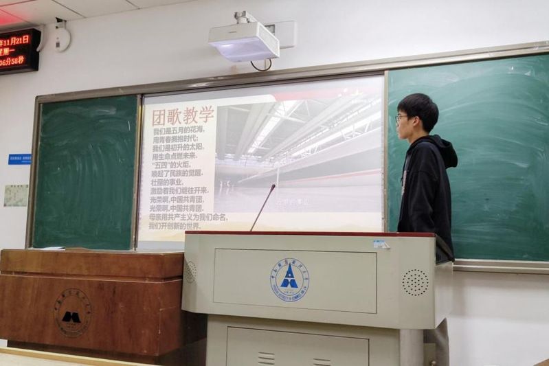 首先,辛逸阳同学带领全体同学合唱了中国共产主义青年团团歌。“我们开创新的世界”,熟悉的高昂曲调唤起了全体团员入团时的青春记忆,让大家重温了入团时那份纯粹真挚的初心,激起了全体同学对团组织的热爱。
