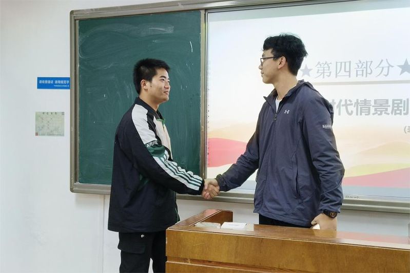 然后,尚稣平同学和曾健楠同学带来了一段以优秀青年榜样苏正民为原型的微情景剧。曾健楠同学扮演苏正民,尚稣平同学扮演其导师,两人在讲台上生动精彩的演绎既拉近了榜样与同学们之间的距离,也让同学们了解到了优秀青年榜样苏正民的光辉事迹。