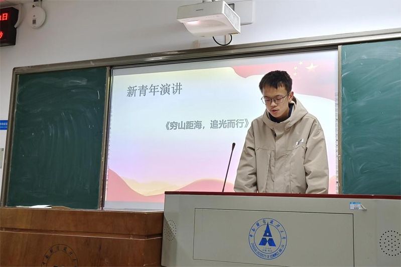 随后,吕博涵同学上台进行了名为“穷山距海,追光而行”的主题演讲。在演讲中,吕博涵同学表达了自己作为团员与新青年爱党爱团的一片热忱,和努力成为青年榜样的愿望与决心。字字句句,饱含深情。