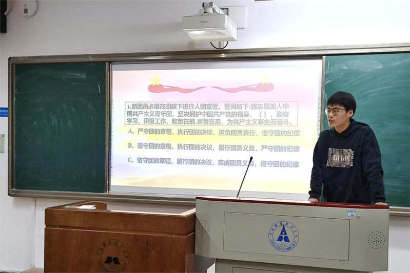 接着,辛逸阳同学用三个小问题检测了全班同学对党团知识的了解度,同时也以问题的形式间接向大家介绍了党团知识。同学们积极回答,既活跃了班会气氛,又巩固了自身学习到的党团知识,入团誓词作为“彩蛋问题”更是激发了团员们深深的共鸣。