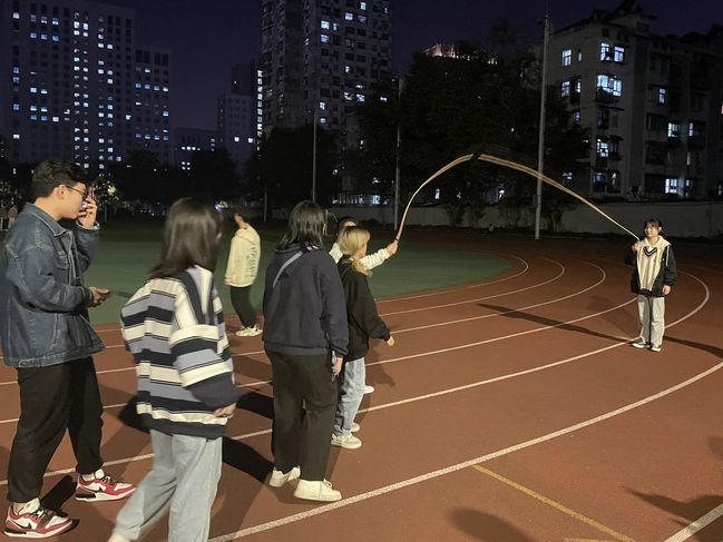 游戏不仅包括“两人三足”、“象鼻转圈”、“长短绳连跳”,还有考验同学们耐力的“一公里跑”。同学们两两组队一起游戏,欢快的笑声回荡在南运场。参加活动的同学们在场地上肆意奔跑,尽情挥洒汗水,用手中的荧光手环和心中对公益的热爱将漆黑的南操场点亮。运动后,同学们在志愿者的指导下通过微信“一块走”小程序捐赠步数,为“心梗救治”等公益项目捐步筹资,并凭借卡片的盖章数量兑换奖品。同学们热心参与公益事业,通过捐赠步数的志愿行为,发扬了“奉献、友爱、进步、互助”的志愿精神,为需要帮助的人送去温暖与关爱。