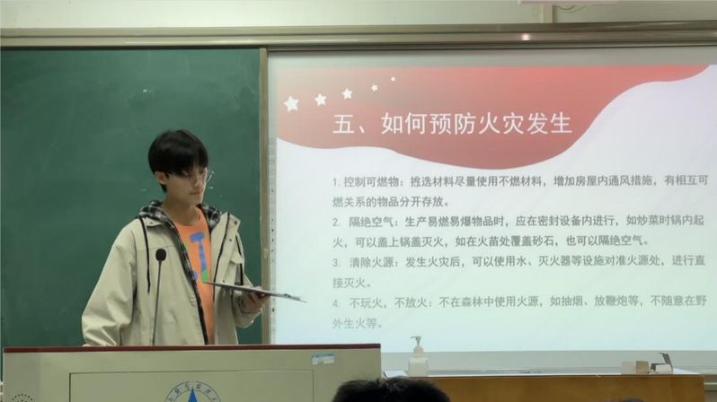 活动进入第二部分,班长朱建豪进行了消防安全知识科普。他指出11月9日是国家综合性消防救援队伍组建一周年,秋冬季节也是室内火灾的高发季节,因此在这个时间段科普消防安全知识是十分必要的。本次火灾的安全教育内容分为:正确认识火灾、火灾发生的原因、火灾的危害、遇到火灾时应采取的措施和预防火灾发生的措施五部分。“火无情,人有情;齐防火,共安宁”。只有提前科普才能让我们在面对火灾时能够从容应对,最大程度上减轻火灾带来的伤害。