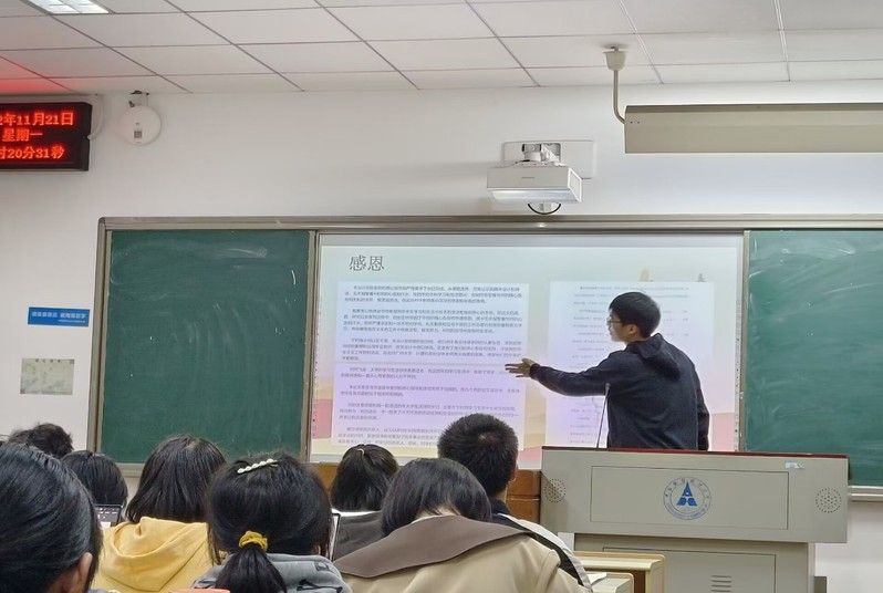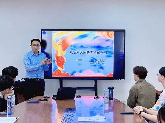 国贸实验2101团支部则结合支部实际,于11月11日举办了专业特色鲜明的“从贸易大国走向贸易强国”主题团日活动。活动上,班级导师宋伟良老师借党的二十大与国际贸易的关系引入正题,实证分析,旁征博引,将党的二十大内容与专业知识相结合,在学科融合中深化对党的二十大精神的学习与体会。在活动的最后,宋老师也鼓励支部青年们牢记国贸人的使命感,牢记国贸人肩上担负的责任,以建设贸易强国为国贸班同学不断奋斗之目标,为中华民族伟大复兴添砖加瓦。