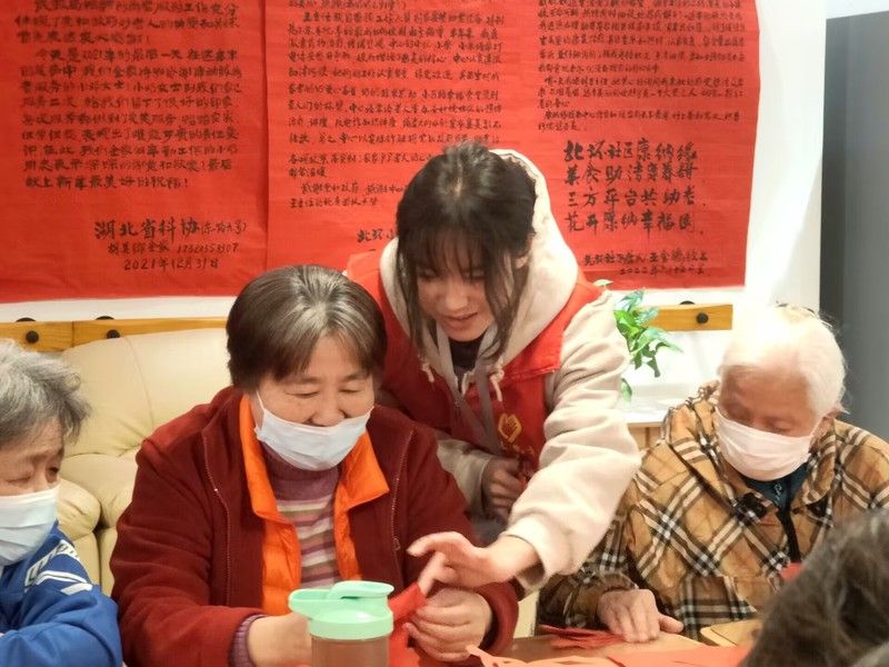宏伟蓝图激荡人心,号角声声催人奋进。剪纸活动过后,结合党的二十大精神和老年人的实际生活,志愿者从人民美好生活、中华民族伟大复兴、党的坚强领导核心以及当今世界局势这四个视角出发,用简单浅显的话语带领大家学习了党的二十大报告的主要内容,领悟其深远意义。志愿者讲述了新时代近十年来的伟大变革,深情讴歌了中国共产党带领中华民族走向富强、实现第一个一百年目标的伟大壮举,使党的二十大精神真正融入生活、深入人心。听完志愿者的讲解,老人们难掩对党和祖国的赞美,纷纷鼓掌,其中一位老爷爷还激动地高呼:“中国共产党万岁!”