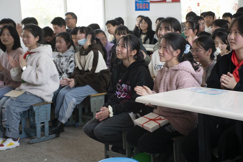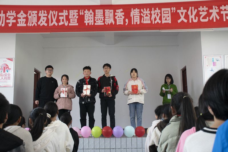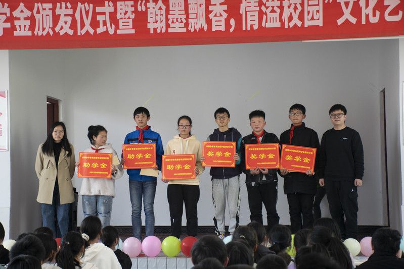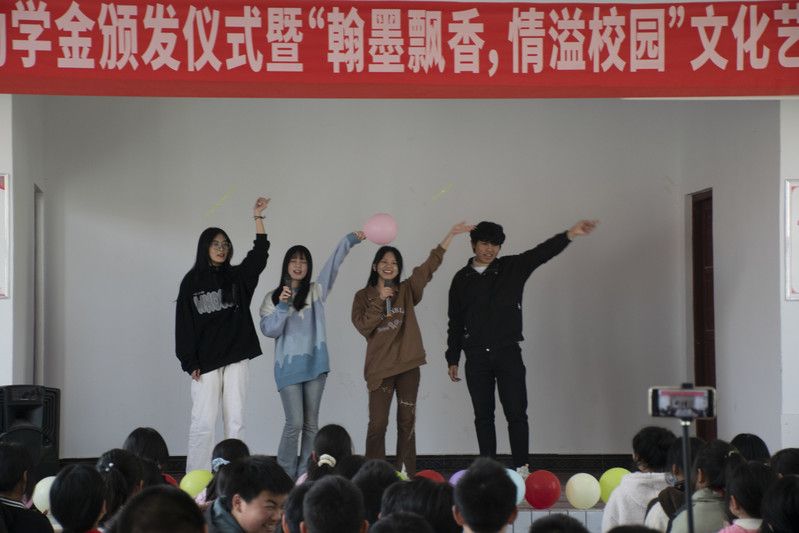 曙光辉映朝阳,爱心温暖校园。活动伊始,在热烈的掌声下,何强老师代表青鸟志愿服务队为涂镇中学优秀学生颁发奖助学金并启动赠书仪式,鼓励其立大志、明大德,将来成大才、担大任,成为优秀的时代新人。其中,奖助学金由青鸟志愿服务队经营诚信商店挣取,总数达千余元;捐赠的600余本图书则通过图书募捐活动进行收集,借此希望能够托起同学们的阅读梦,让其领悟“书香气自华”的魅力。随后,志愿者们还为涂镇中学的学生们准备了丰富有趣的文艺节目:风趣幽默的小品引人捧腹;声情并茂的朗诵惹人动容;歌曲串烧带动着氛围一同合唱。这些精彩的表演使学生们开怀大笑,同时志愿者们的热情和才能使其真切感受到了来自社会的温暖和关爱。