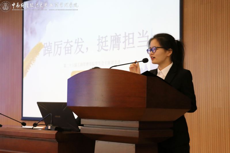 “初心如磐,奋楫笃行”,三号候选人李锐玲从学习科研、志愿活动、体育运动和获奖经历四个方面进行自我介绍,以“克己奉公,扎根团学”总结个人在生活权益、礼冠工商、权伴工商和劳动教育方面的工作,并从组织建设、培训体制、品牌活动和工作理念等几个方面阐述未来规划。