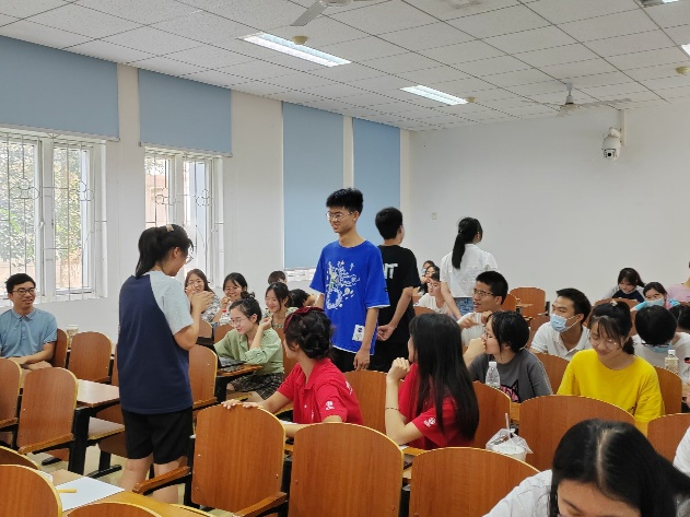 紧接着,黎铧珊同学组织大家开展“你画我猜”趣味小游戏。在游戏过程中,每位参与的同学都非常投入,排在队列前面的同学努力地向后一位同学比划给定的成语。比划的同学们略为抽象的动作逗得台下的同学们哈哈大笑,现场的氛围轻松愉快。
