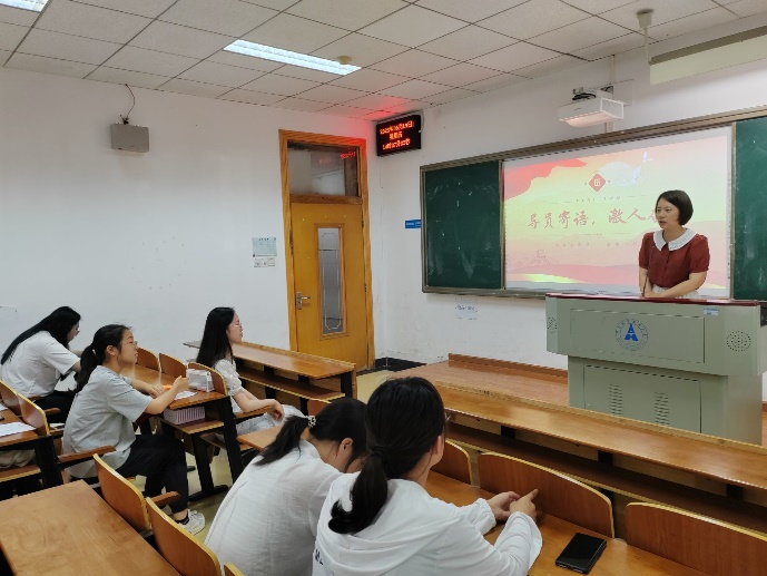 韩曼卿同学向大家介绍了扶贫英雄黄文秀的故事。“ 2016年硕士毕业后,黄文秀毅然选择回到家乡,当一名定向选调生,扎根基层。‘我来自贫困山区,我要回去,把希望带给更多父老乡亲,为改变家乡贫穷落后面貌尽绵薄之力。’黄文秀如是说。在任职1年多的时间里,她帮助全村88户418人脱贫,将贫困发生率从22.88%降到2.71%,整村脱贫指日可待。黄文秀30岁的芳华永远定格在了脱贫攻坚路上。在五四青年节来临之际, 我们要学习黄文秀书记不怕苦不怕累,一心为民,敢于奉献的精神,让自己的青春在祖国最需要的地方绽放。”