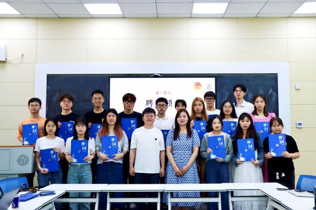 仪式第一项,由何强老师和杨思琦老师为第二十五届团学志负责人颁发聘书并合影留念。