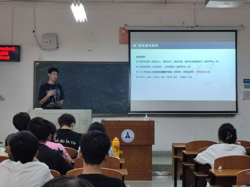 主题班会的第二环节是20级优秀师兄师姐的榜样故事经验分享会。游耀宇师兄主要介绍了保研的经验,例如推免申请的基本信息,包括推免的硬性条件、成绩计算和奖项明细划分;并根据商务分析专业依托数据进行商业分析的专业性质,对我们以后的专业选择、时间规划提供了宝贵的建议。最后,他也以自己申请保研过程的经历,真切的鼓励我们要“大胆且自信”、“不要害怕拒绝和失败”。
