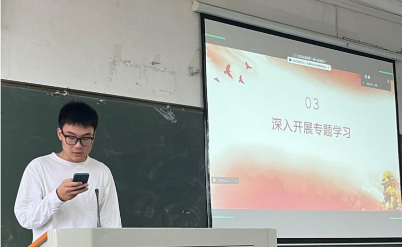 会议第四项,国贸实验2001班赵坤宇同志带领全体党员学习党的教育科技人才的战略布局,理解教育强国关键在于培育担当民族复兴大任的时代新人,建设高质量教育体系以及社会全体对教育强国建设的共同推进。