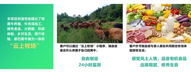 该项目提出了将黄牛养殖、牛肉深加工、绿色食品、大数据、牧旅体验、乡村生活、用户体验、郧巴黄牛融为一体的“云上牧场”小程序,构建互联网养牛新模式。