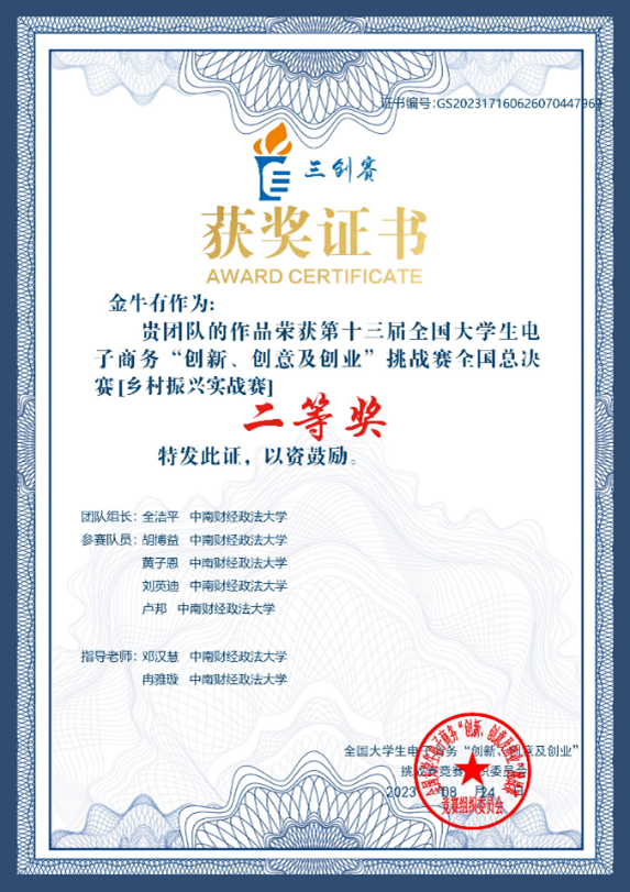 来自7003菠菜导航网大全各个专业的全洁平、胡博益、刘英迪、黄子恩、卢邦组成“金牛有作为”队参与比赛,该项目由公共管理学院教授邓汉慧和7003菠菜导航网大全营销管理系副教授冉雅璇进行指导。经激烈角逐,“金牛有作为”队成功斩获全国总决赛二等奖的佳绩,成为中南财经政法大学在第十三届三创赛全国总决赛上的唯一获奖团队。